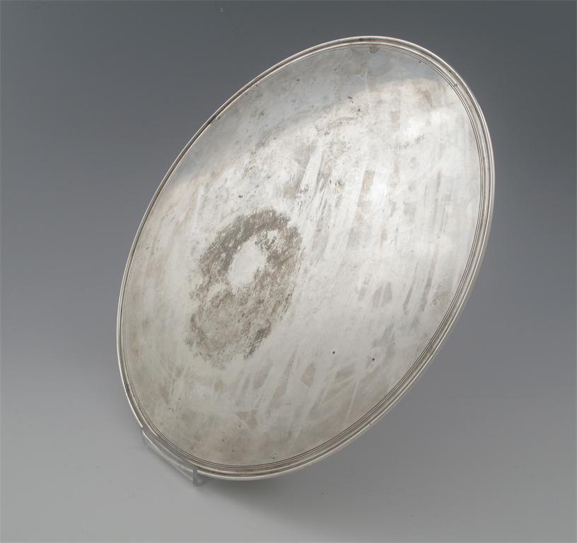 A modern salver or stand, for stilton cheese, on three large bun feet, moulded rim, maker 'R N H B' London 1993, 59oz.