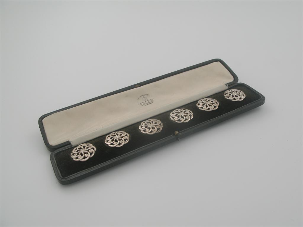 A cased set of six pierced buttons, of swirling design, with English import marks for London 1910.