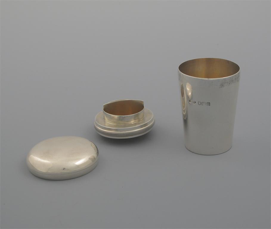 A curious Edwardian vessel and cover, and a lift-out central section, with a divider, gilt interiors, by C & G Asprey, London 1908, 3in (7.5cm) high, 3.5oz.
