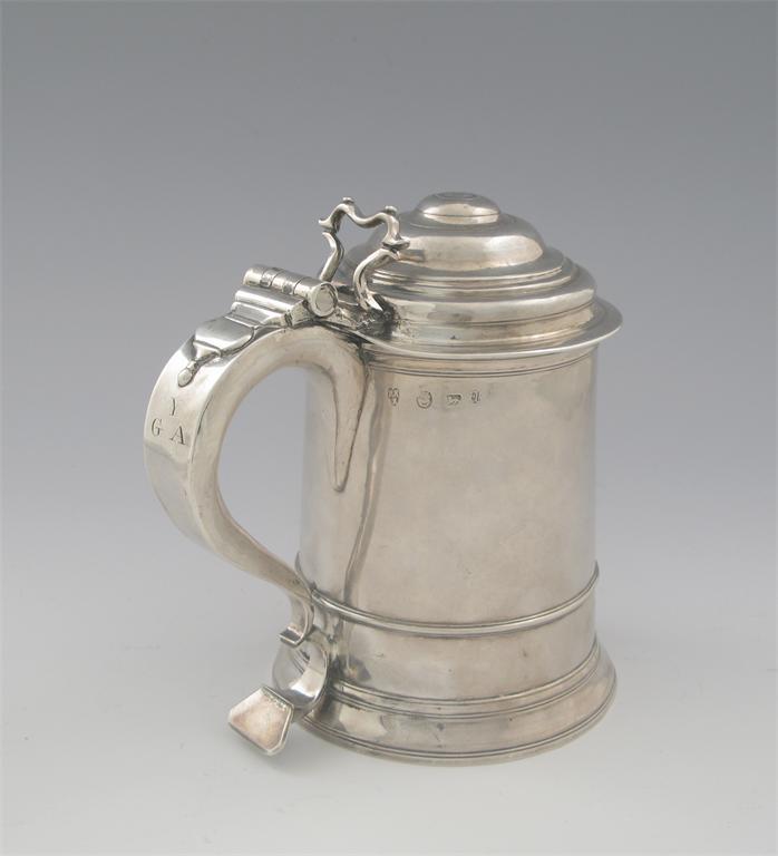 A George II North County Provincial tankard, squat tapering with a skirted base, a multidomed cover and a large scroll handle initialled 'Y' over 'GA', chairback thumbpiece,. the body with large script initials 'GAY' by Thomas Makepeace (I), Newcastle 1732, 7.1in (18cm) high.