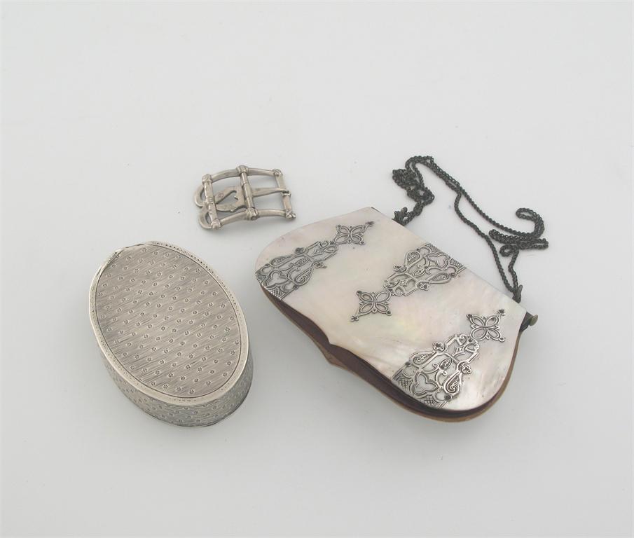 A mixed lot: a 19th century mother of pearl mounted purse, with silver inlay, probably French, a 19th century oval snuff box, engraved all over with a repeating pattern of flowerheads and 'rayed' ground unmarked and a single continental buckle, probably late 18th century, makers mark 'C.L'. (3)