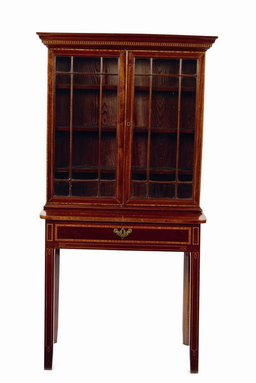 A mahogany bookcase on stand, inlaid stringing, with a pair of glazed doors enclosing adjustable shelves, the base fitted a frieze drawer, on square supports, early 20th century, 60in (152cm) h, 32in (81cm) w, 15.5in (39.4cm) d.