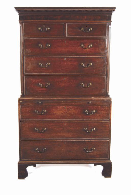 A George III mahogany chest on chest, with mahogany lined drawers fitted original brass handles, the base with a slide on high bracket feet, 77.25in (196cm) h, 43.5in (110.5cm) w, 22in (56cm) d.
