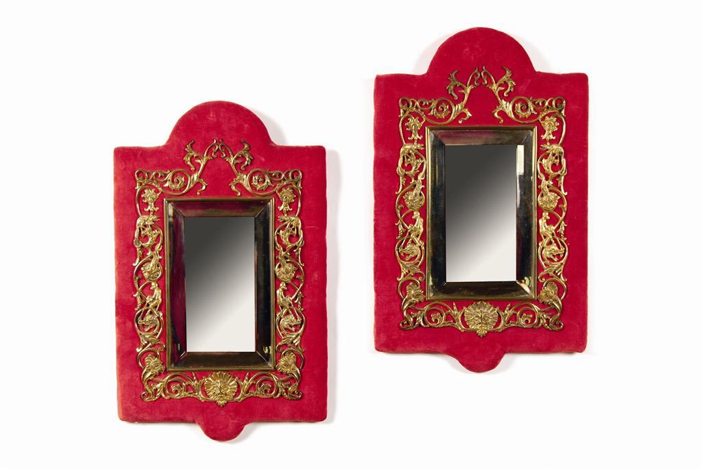 A pair of wall mirrors, with rectangular bevelled plates, set within a bow ended plush lined mount with gilt brass applied inner frame, 19.5 x 12in (49.5 x 30.5cm). (2)