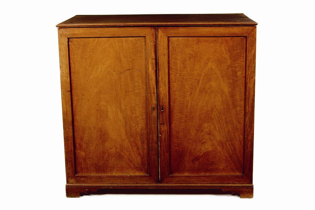 A late George III mahogany low linen press, the rectangular moulded edge top above a pair of panelled doors enclosing six oak reeded edge slides, on bracket feet (possibly reduced), 42.25in (114.6cm) h, 48.5in (123.2cm) w, 27.5in (69.7cm) d. Crack to left hand side and top, chips and minor losses.