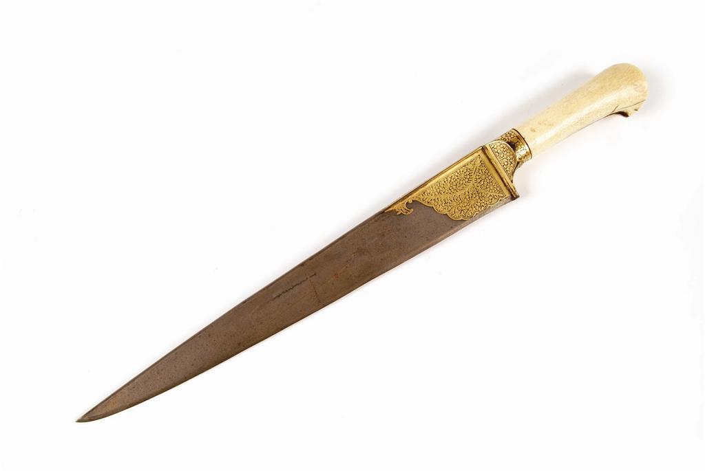 A 19th century Indian pesh-kabz, with koft-gari work foliage decoration to the tapering blade and with a bone handle, 19in (48cm) l.