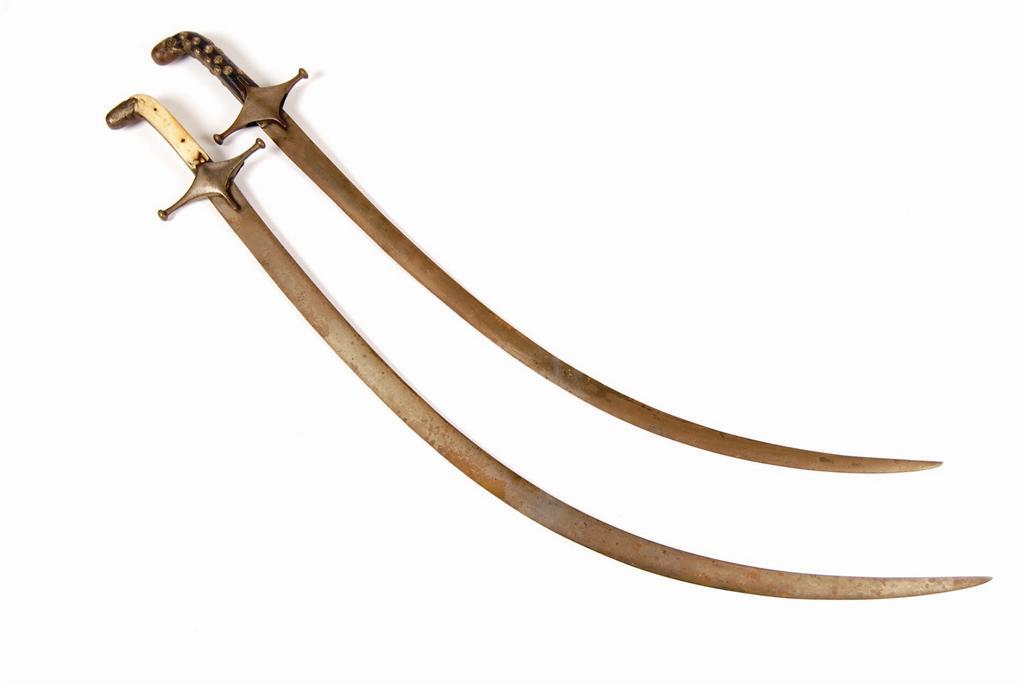 An Indian shamshir, with a curved blade and bone and steel handle, 36.75in (93cm) l, and another with a lacquered wood handle having applied prunts. (2)