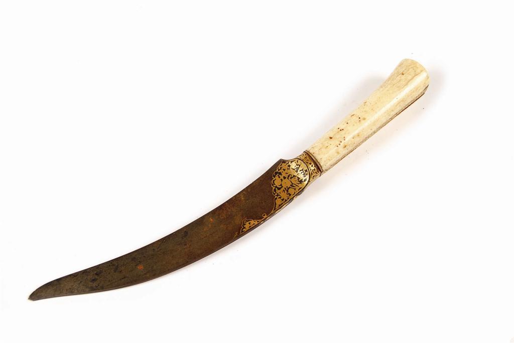 An early 19th century Indian knife, with a curved damascene blade with ribbed top edge and with koft-gari foliage decoration, having and walrus bone handle, 12.75in (32.5cm) l. tip of blade missing.