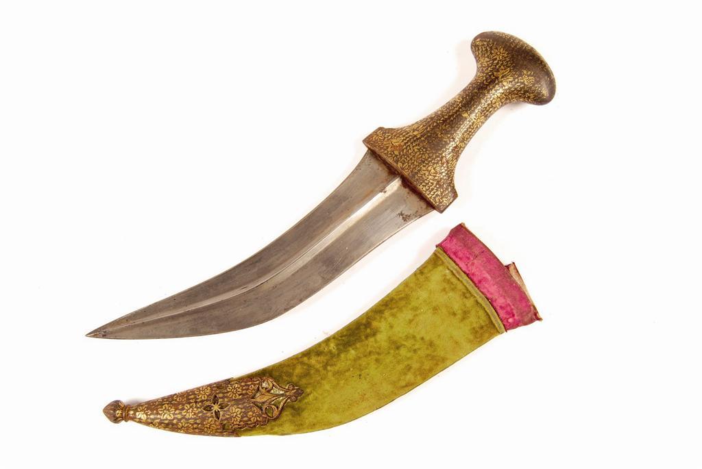A 19th century Persian jambiya, with a curved double edged blade and a medial ridge and a koftgari work decorated handle, 12.5in (32cm) l, with scabbard.