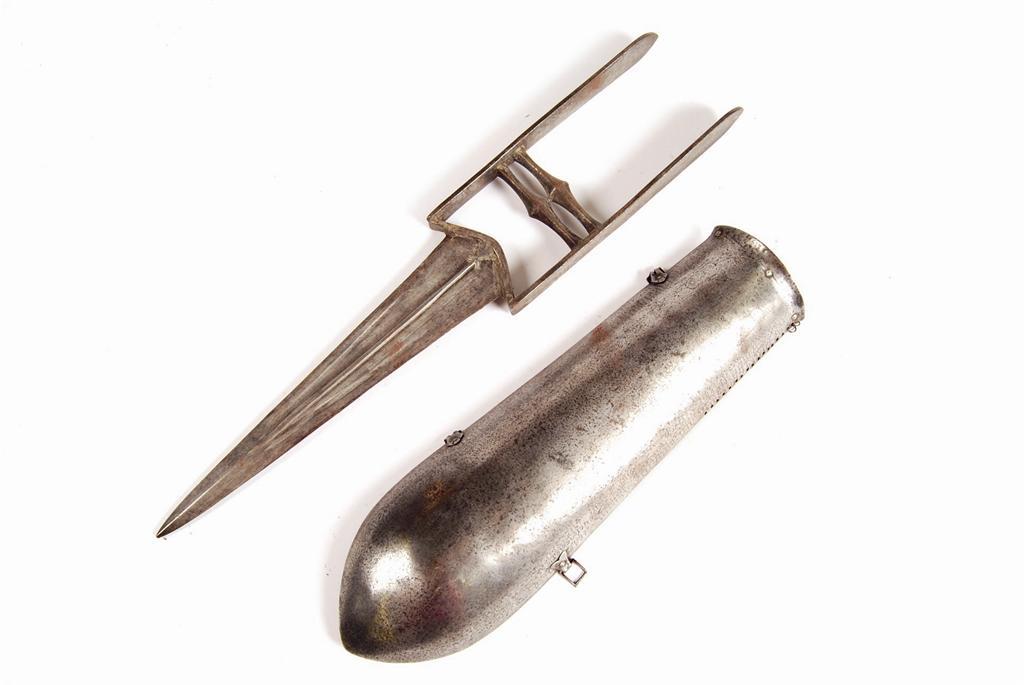 An Indian steel katar, 18.5in (46cm) l, and a Persian forearm guard, with traces of decoration, 13.5in (34cm) l. (2)