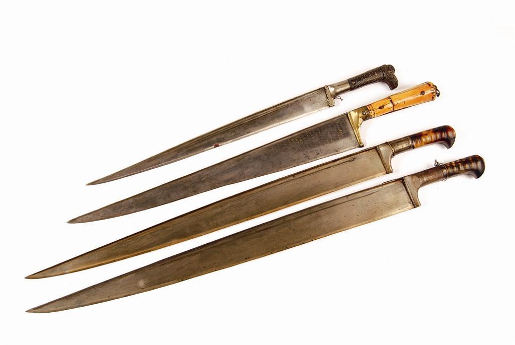 A 19th century khyber knife, with a part inlaid blade and ivory handle, 25.75in (65.5cm) l, and three khyber knives with bone handles. (4)