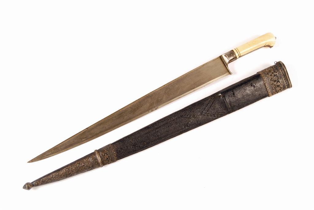 A 19th century Indian khyber, with tapering blade and faceted hilt with bone handle, 23.75in (60cm) l, with an associated scabbard having silver coloured metal foliage mounts. (2)