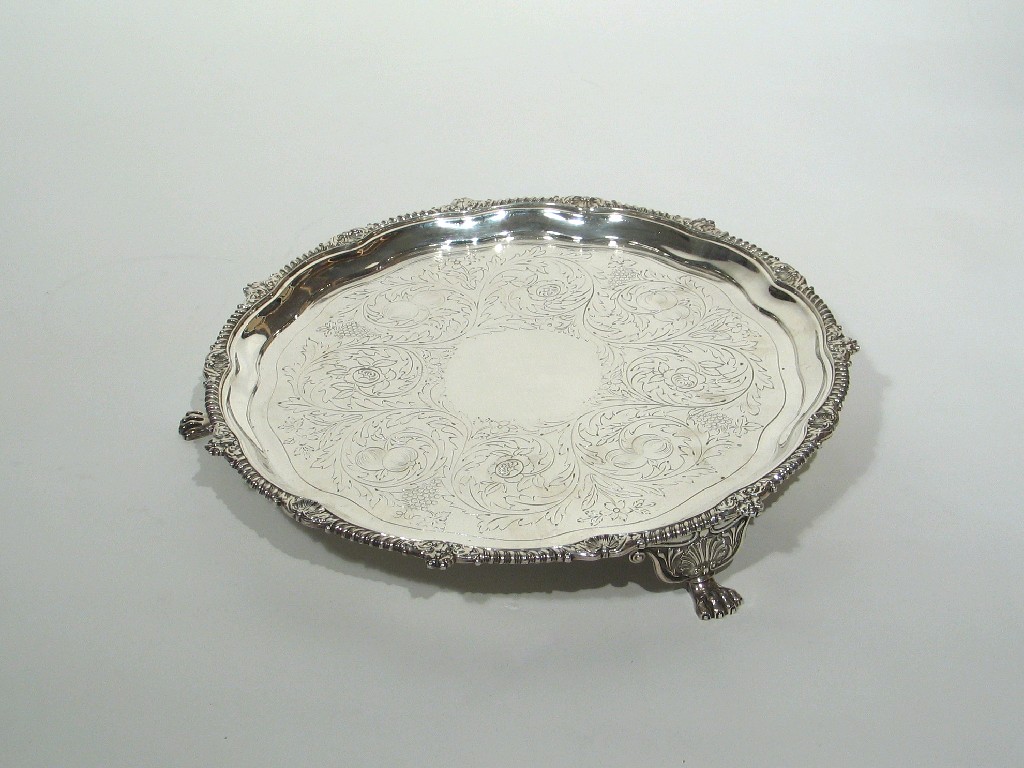 A George III salver, of shaped circular outline on three large paw and bracket feet with a border of shells and gadrooning and flat-chased floral decoration around a vacant centre, by I.W. Storey & W. Elliott, London 1812, 16.5in (42cm) diameter, 66oz.