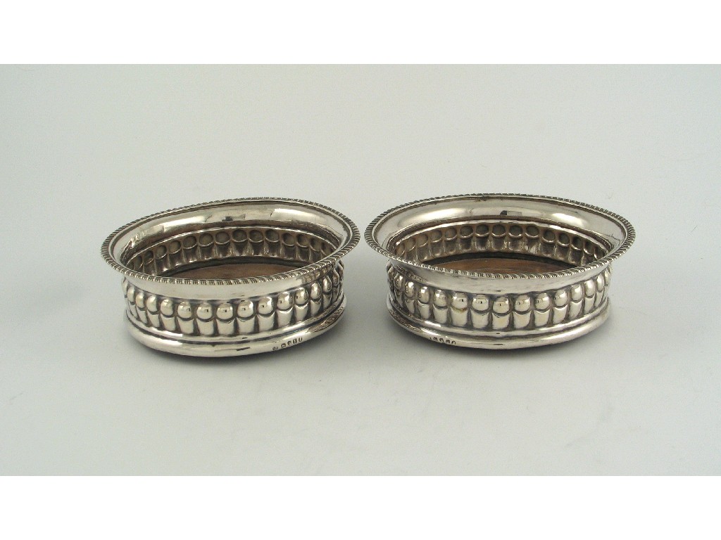 A pair of George III wine coasters, with fluted sides flared, gadrooned rims and turned wooden bases, by Solomon Hougham, London 1814, 6.1in (15.5cm) diameter.