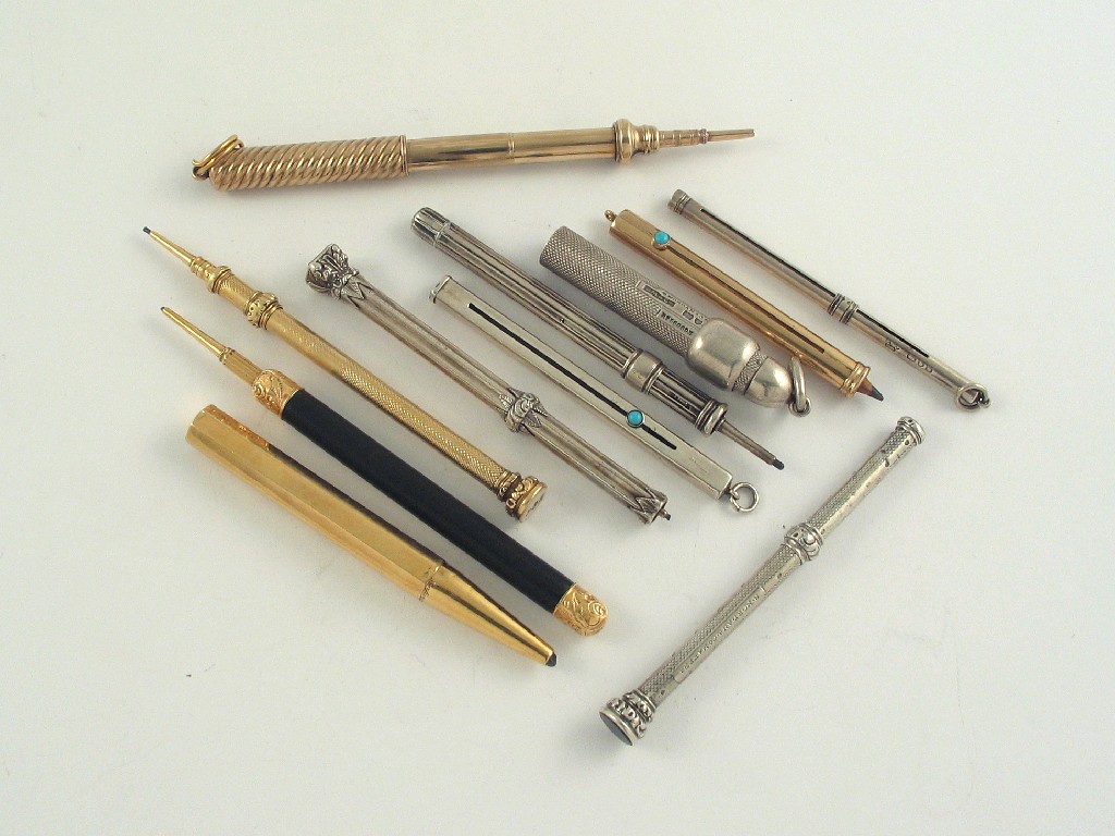 Eleven assorted telescope pencils, mixed designs, dates and makers, including one gilt metal example and some gold examples. (11)