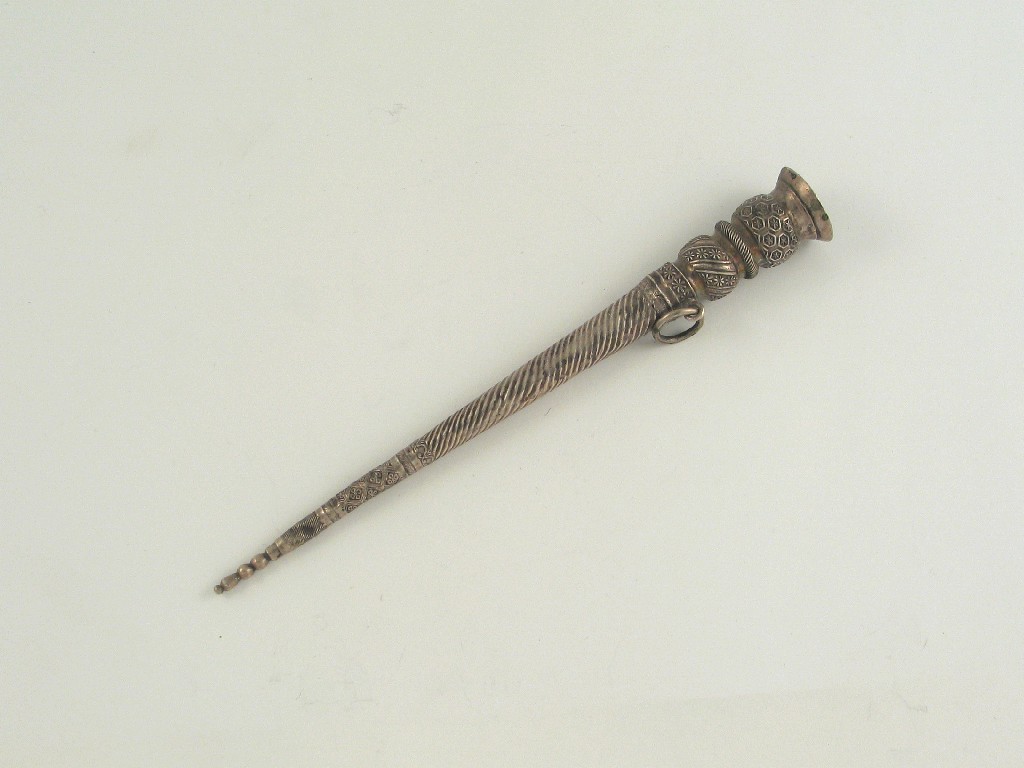 A 19th century continental implement, of tapering form decorated with stamped patterns and wrythen fluting, with pricked initials "RJO" perhaps a torah pointer, Northern European med 19th century, 7.9in (20cm) long, 0.75oz.