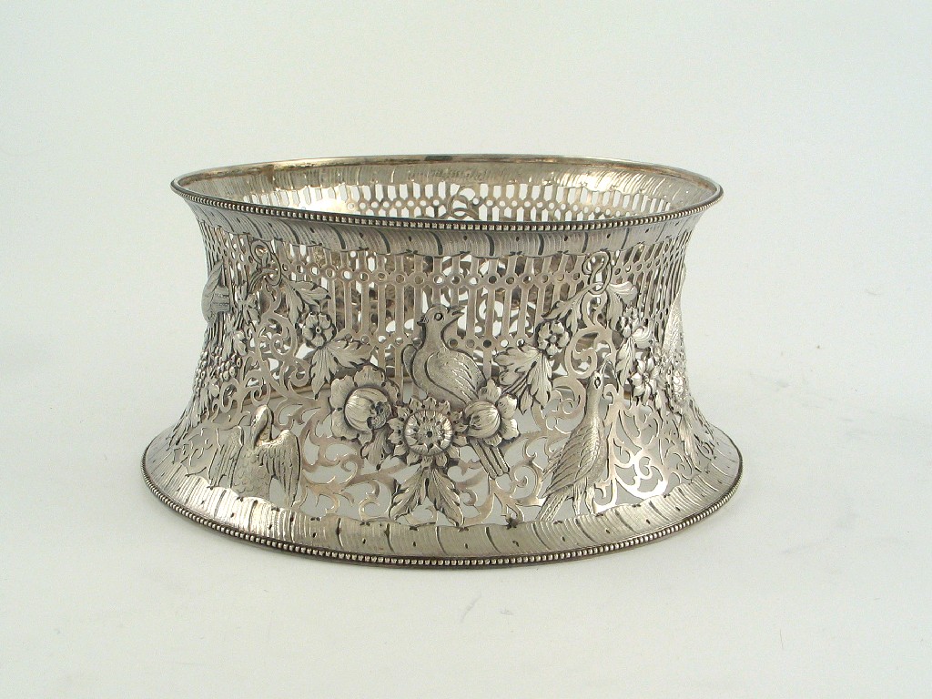 A modern Irish dish ring, of conventional spool form with bead borders, pierced around the sides and embossed with birds and festoons of flowers, pricked out with engraved and chased detail, by West & Son, Dublin 1916, 8.25in (21cm) diameter, 10.25oz.