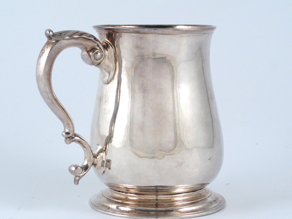A George II baluster mug, with a scroll handle and a spreading circular foot, by Samuel Taylor, London 1749, 4.8in (12.2cm) high, 11oz.