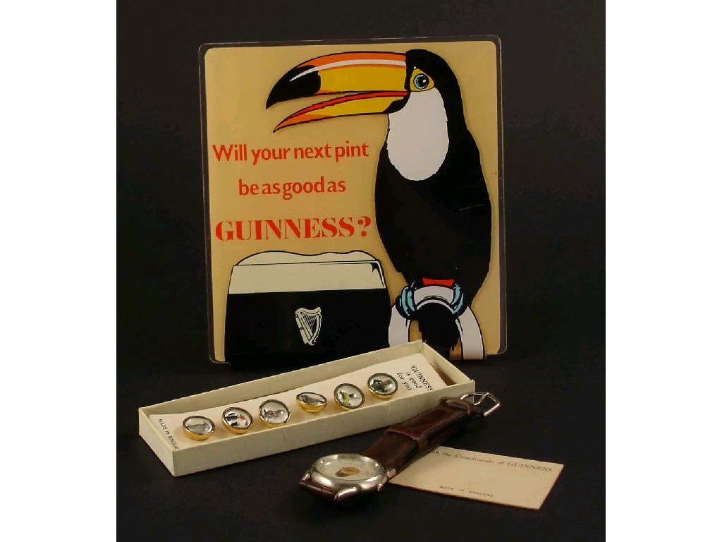 A set of Guinness advertising waistcoat buttons in original box, an advertising watch, a Toucan plastic advert and a small collection of Guinness advertising ware