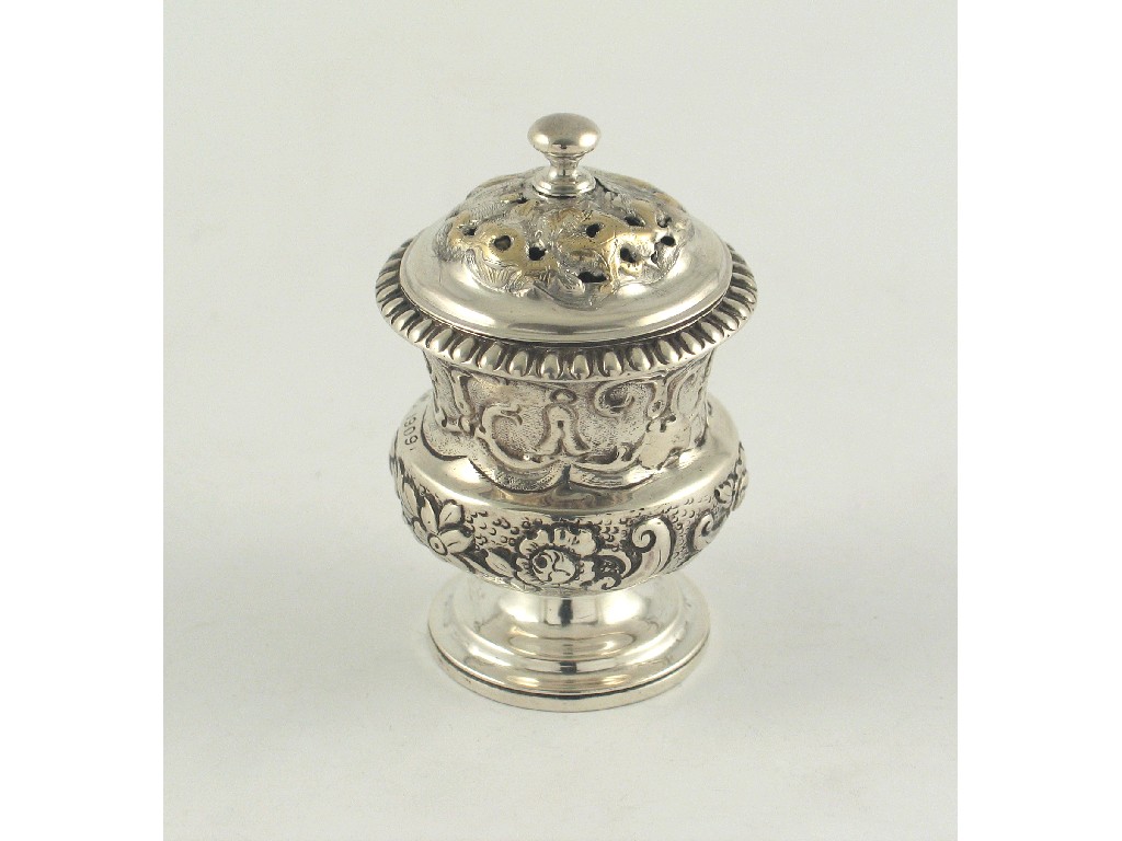 A George III thistle shaped pepper, with embossed decoration and a knop finial, by John Bridge, London 1822, 2.7in (7cm) high, 1.5oz.